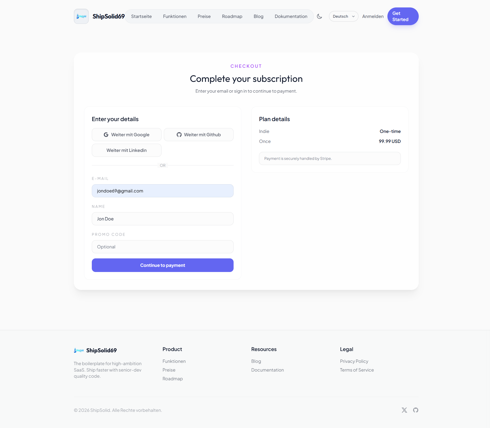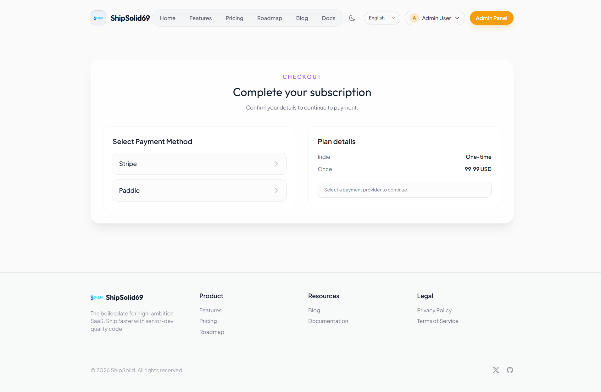Authentication, billing flows, checkout with Stripe and Paddle, admin resources, content surfaces, and a polished marketing layer.